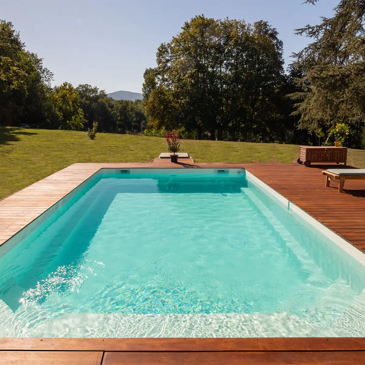 Dank des flachen Bodens genießen Sie durchgehend sicheren Stand und ein besonders komfortables Badegefühl. Ein integrierter, großzügiger Liegebereich am Beckenrand lädt zum Sonnenbaden und Relaxen direkt am Wasser ein – ganz ohne Liegestuhl.