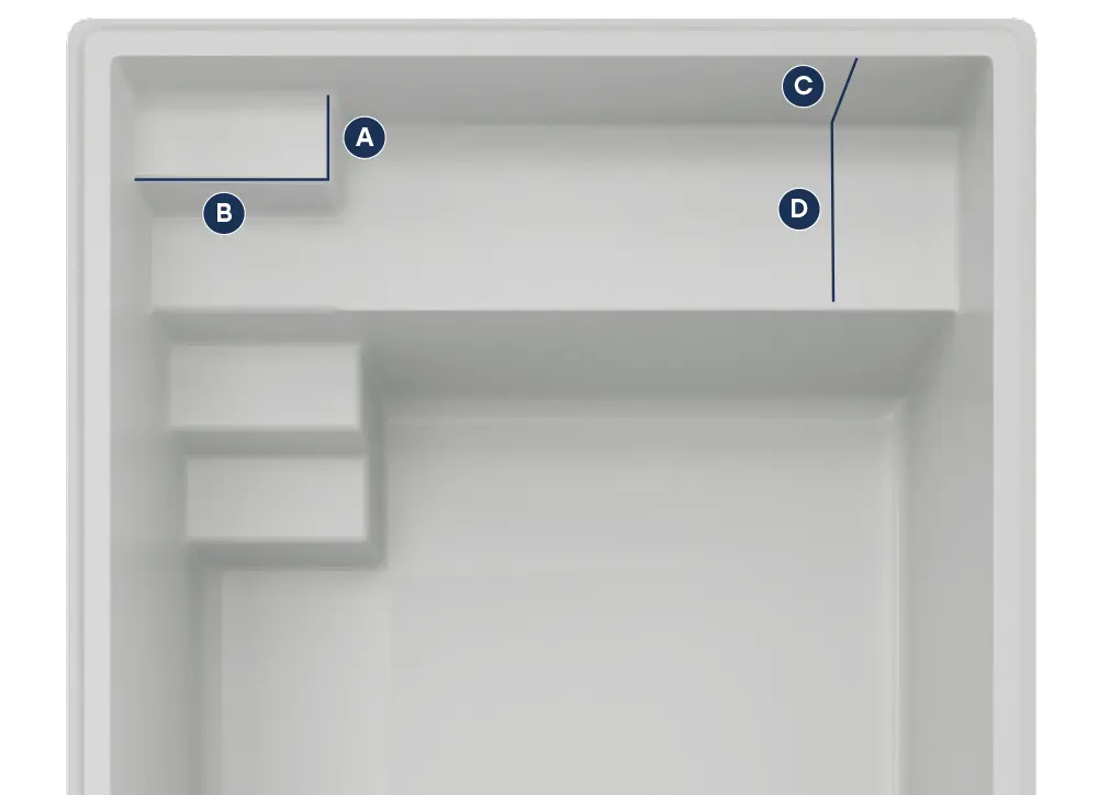 GFK Beckeninnenmaß: 600 x 300 x 140 cm Volumen: 22 m³ Oberfläche: 18,00 m² A: 30 cm B: 72 cm C: 50 cm D: 67 cm