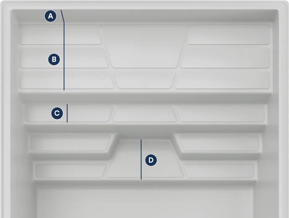 GFK Beckeninnenmaß: 850 x 385 x 150 cm Volumen: 43 m³ Oberfläche: 32,72 m² A: 32 cm B: 108 cm C: 35 cm D: 70 cm