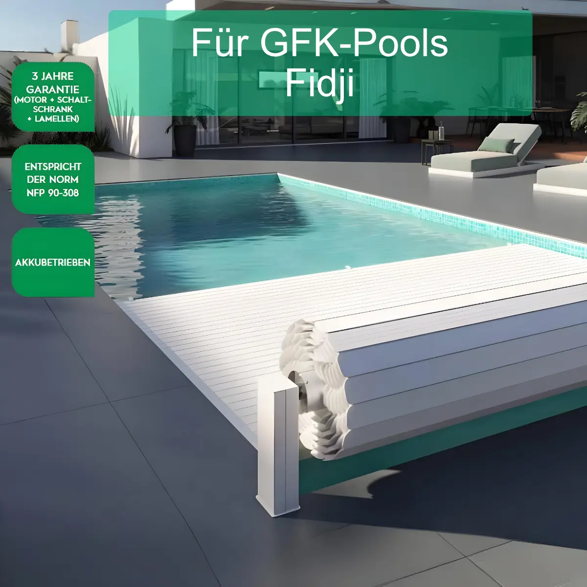Optimieren Sie den Energieverbrauch und erhöhen Sie den Bedienkomfort mit der smarten, akkubetriebenen Rollladen-Abdeckung für Ihren Schalenpool Fidji!
